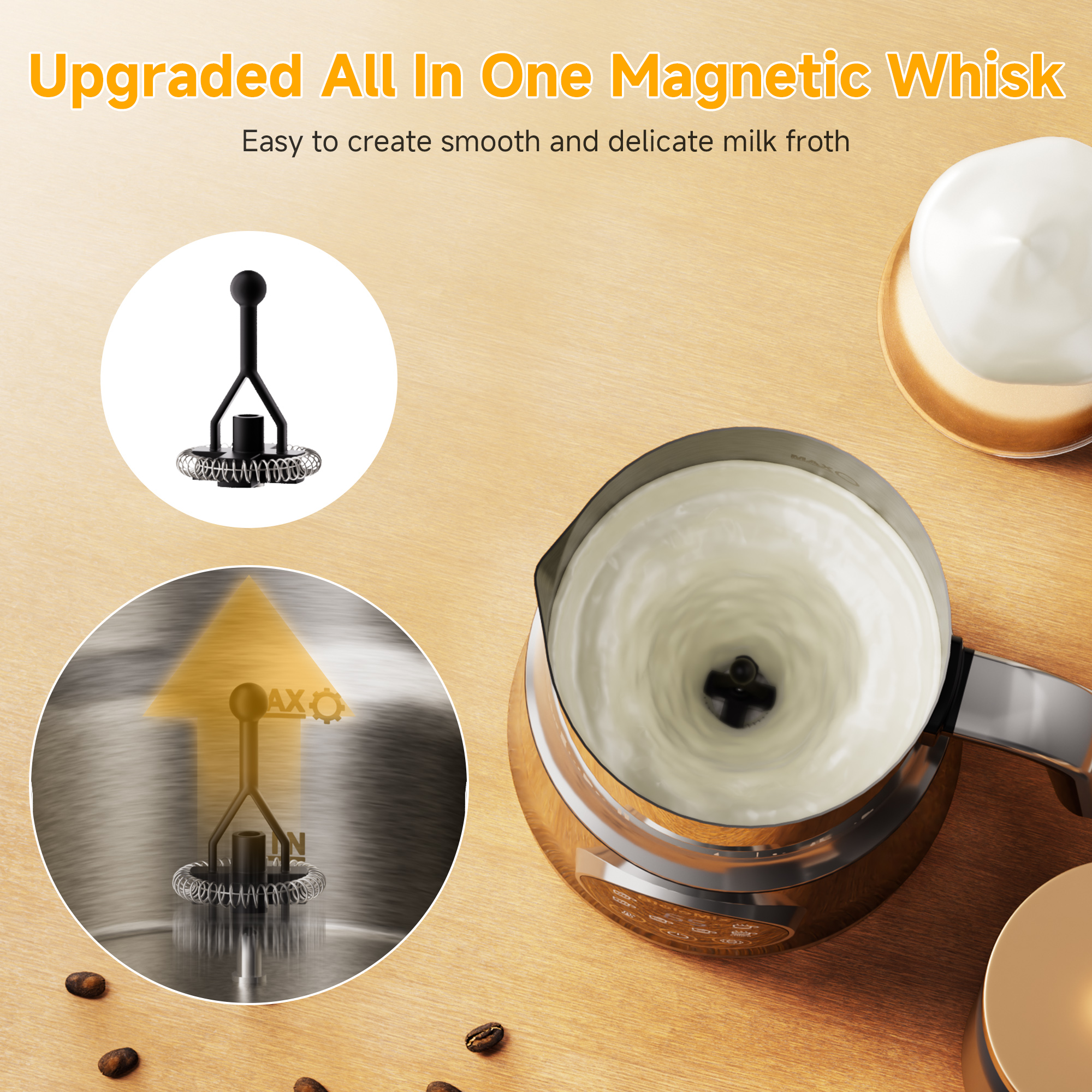【QUIET & QUICK START】: Touch the setting button to select function, selected function LED light on andstart working automatically if no further operation, and start making your milk foam in three seconds, using magnetic drive technology, which can effectively reduce noise and vibration, quickly and quietly whips out rich, fine, long-lasting foam within 3 minutes.